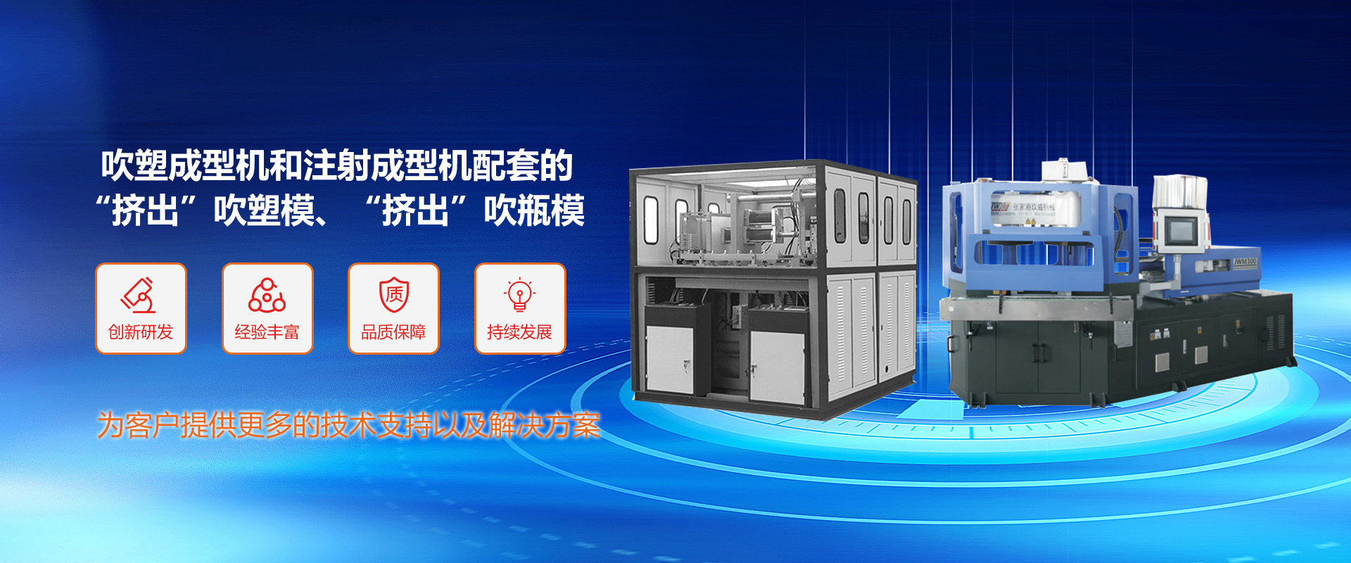 公司可為廣大用戶提供:吹塑成型機(jī)和注射成型機(jī)配套的“擠出”吹塑模、“擠出”吹瓶模、三工位“注--吹”模、PET瓶坯模、PET瓶坯模、熱流道瓶蓋模等,公司專注注吹模具設(shè)計(jì)方面技術(shù),可為使用國(guó)外各種品牌(如美國(guó)的WHEATON、美國(guó)的JOMAR、意大利的UNILOY等)全自動(dòng)三工位“注吹”成型機(jī)的吹瓶廠商提供模具配套,同時(shí)也可為國(guó)內(nèi)全自動(dòng)三工位“注吹”成型機(jī)制造公司提供模具配套服務(wù)。